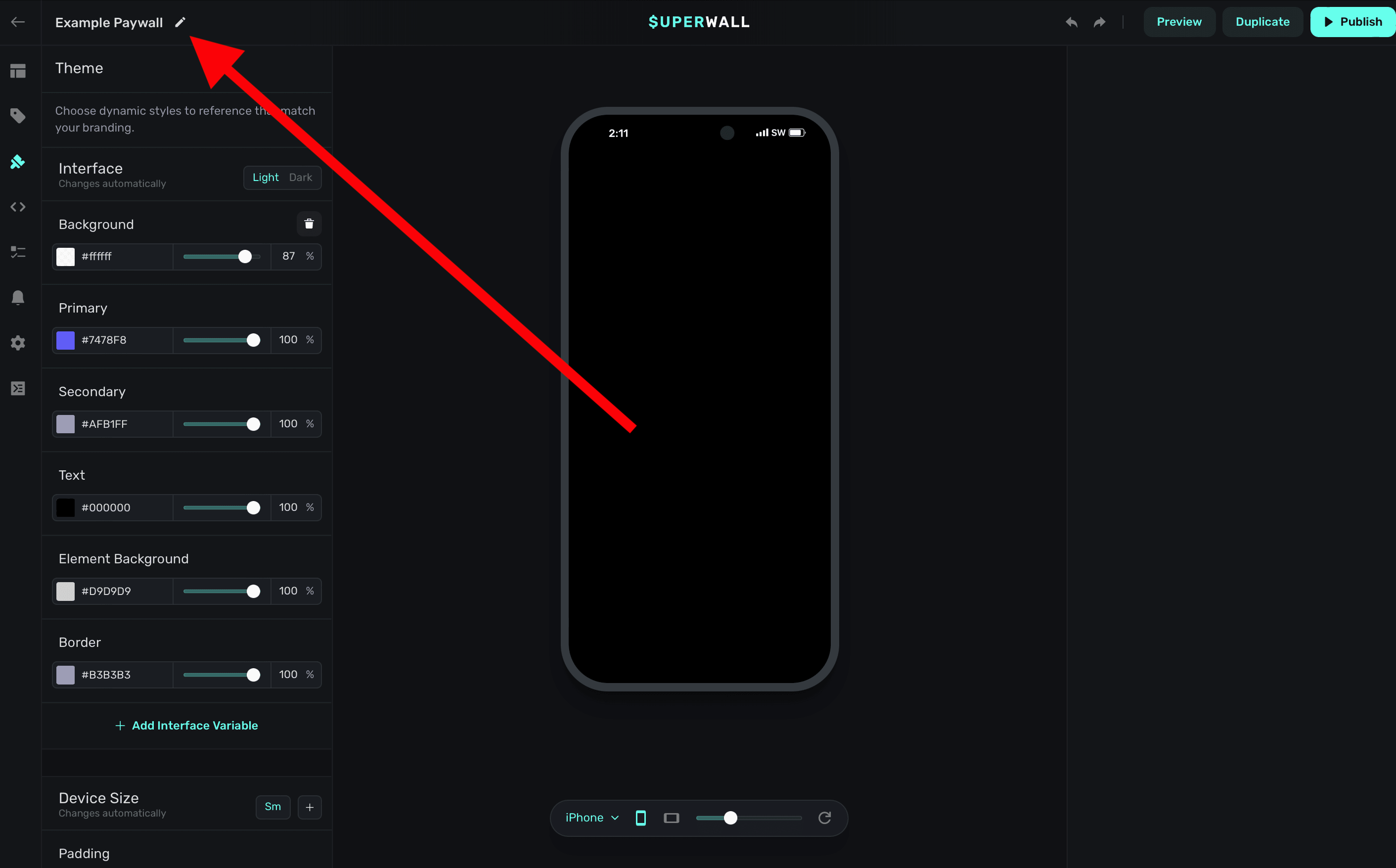To rename a paywall, click the Pencil Icon button in the top-left side of the editor: