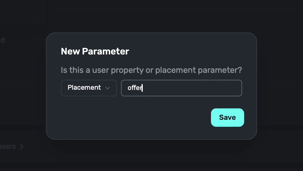 Superwall will ask what type of new parameter this is — choose Placement and enter the parameter name once more (i.e. "offer"). Click Save:
