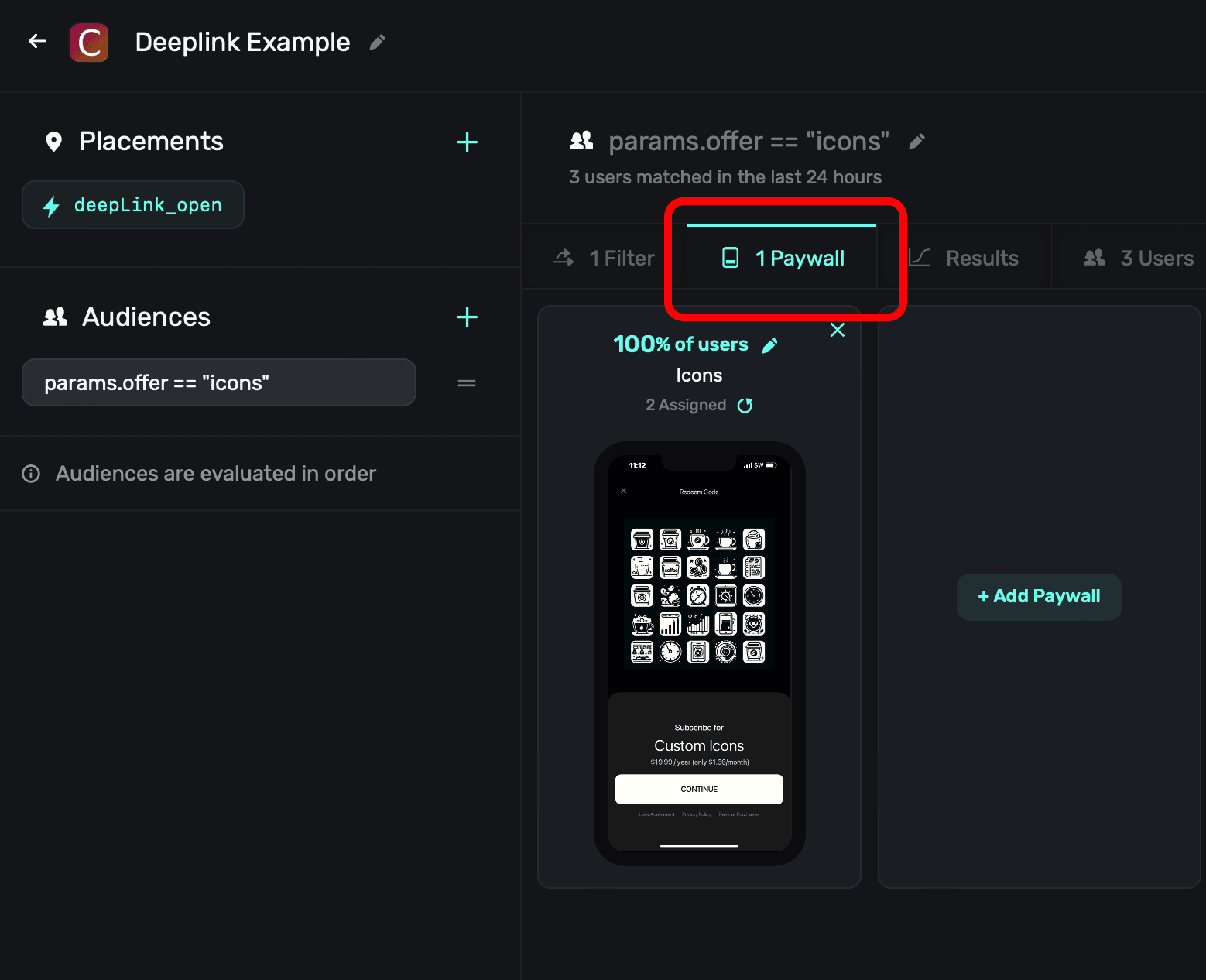They both have the same idea, though. You create a new campaign specifically for this purpose, attach a paywall and either add a filter (for deep linking) or a new placement (for custom placements) to match users to it.