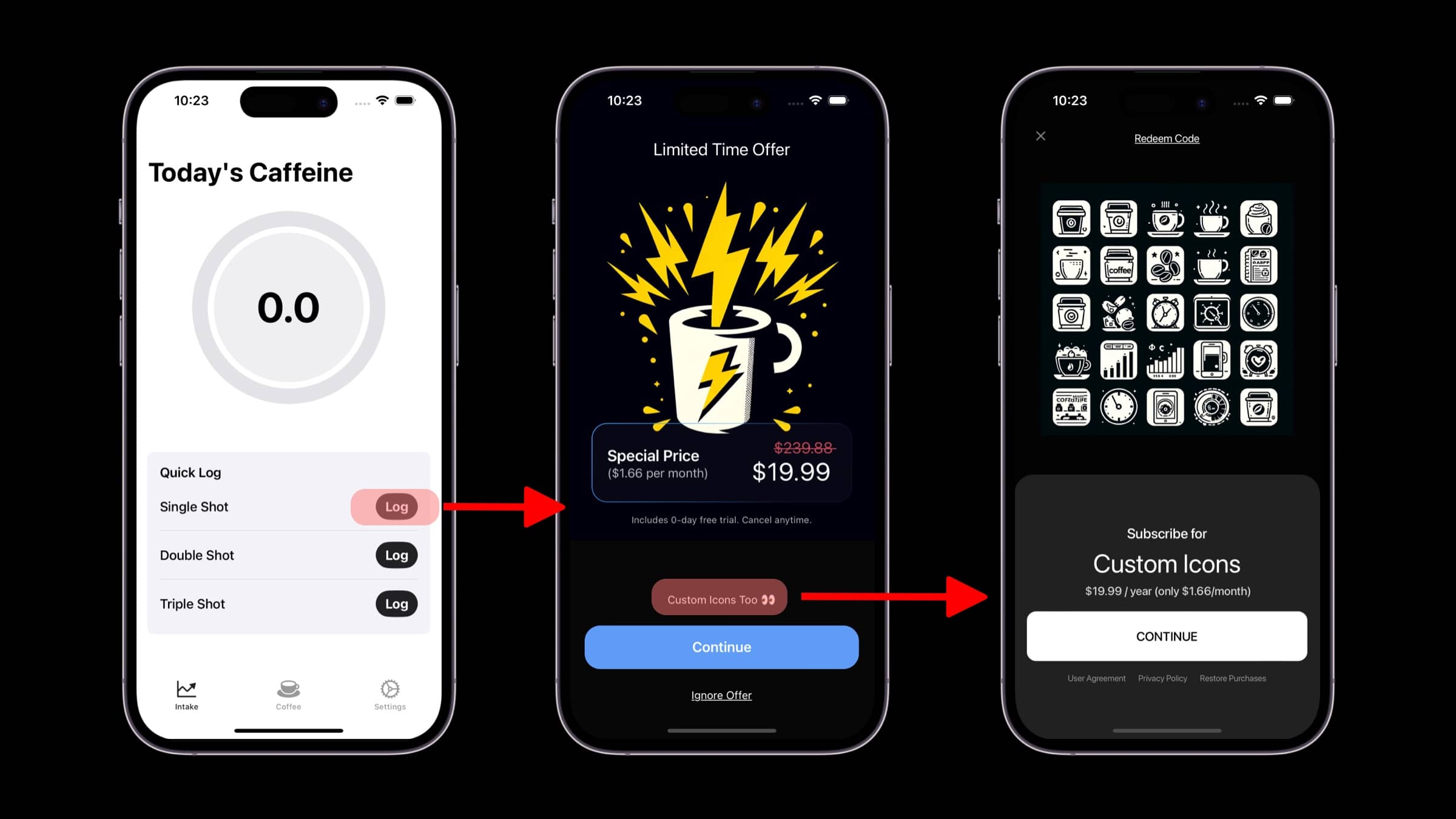 • The current paywall dismisses, and then presents the icons-centric paywall.