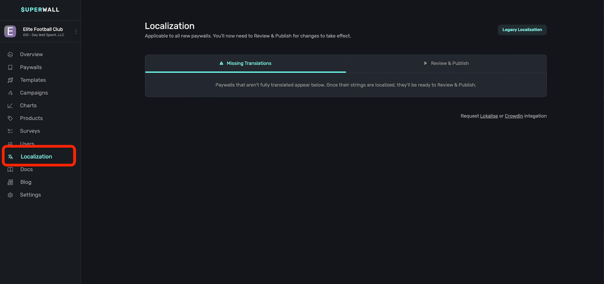 When you make changes to a localized string referenced across more than one paywall, or one is changed via a localization platform provider — you can review those changes by clicking on the Localization button from the sidebar: